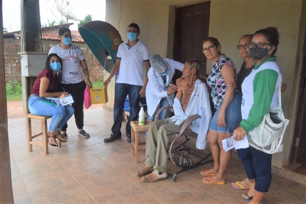 Uma equipe de profissionais da saúde realiza o atendimento em domicílios na zona rural do município para vacinar os idosos contra o coronavírus